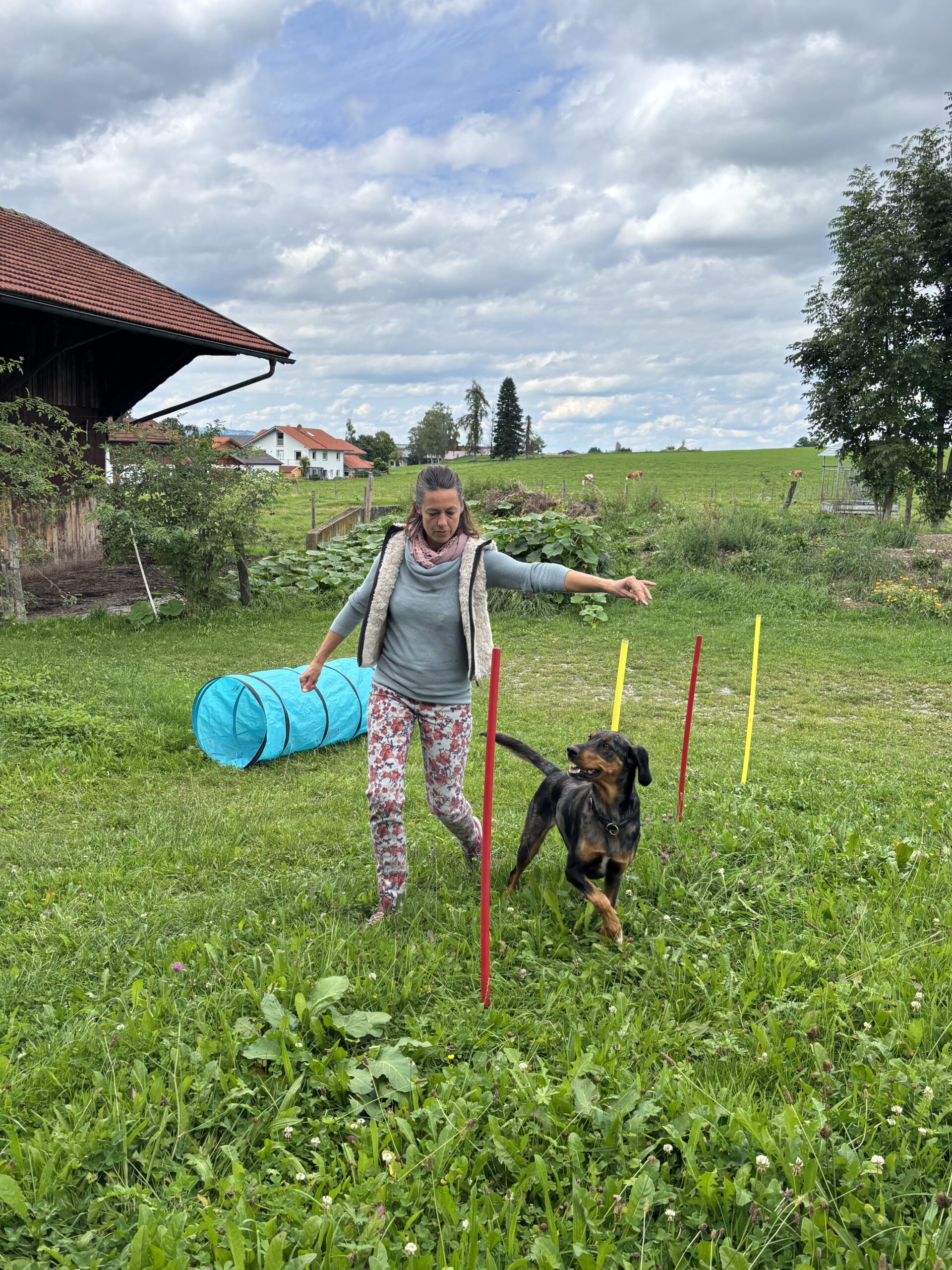 Frau mit Hunden beim Spielen